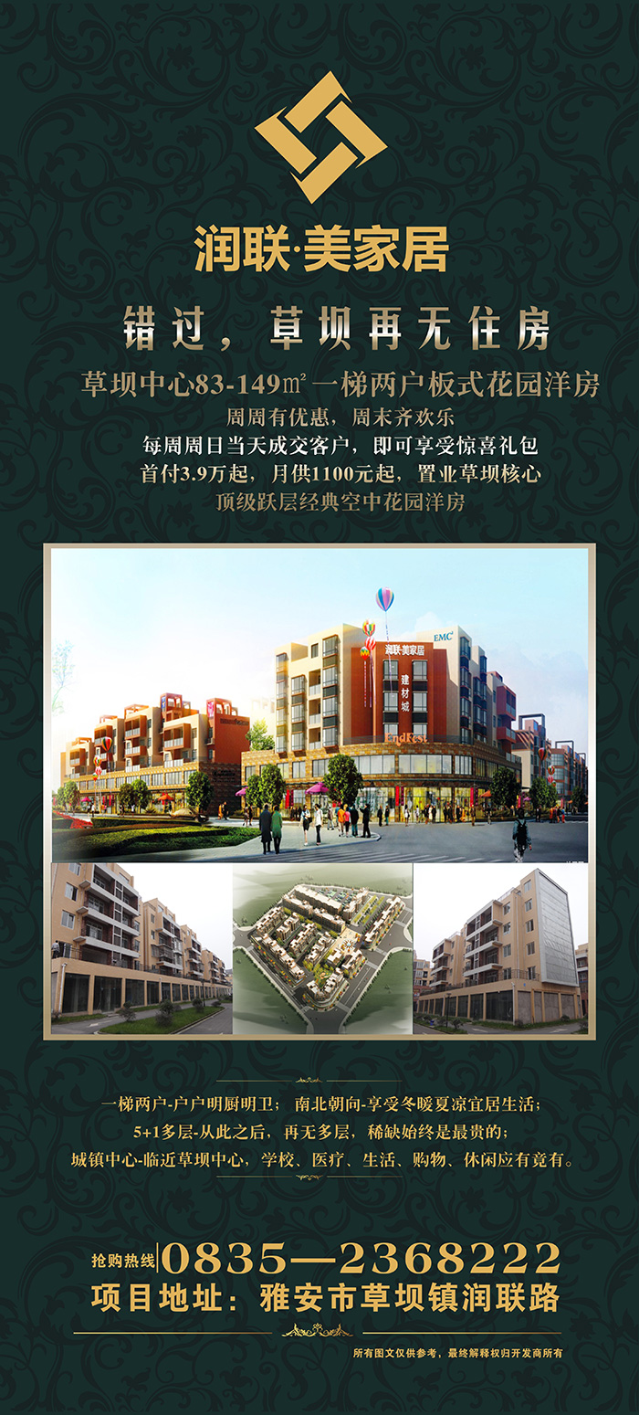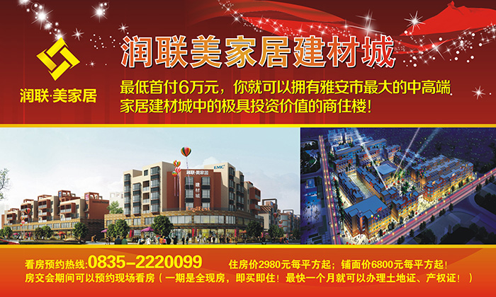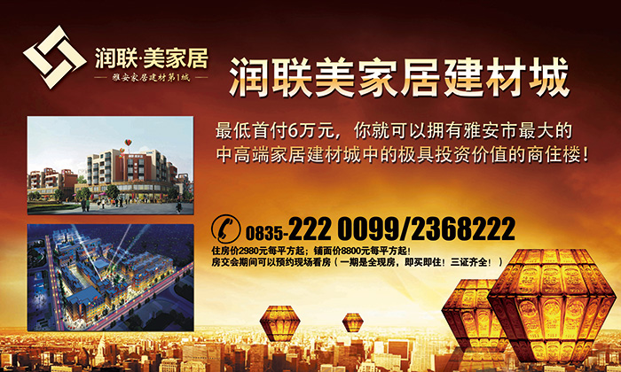潤(rùn)聯(lián)美家居建材城,位于四川雅安市,由香港潤(rùn)聯(lián)國(guó)際投資有限公司投資,雅安市潤(rùn)聯(lián)投資置業(yè)有限公司開發(fā)并傾力打造的雅安市中高端家具建材飾品以及家裝一體化的大型生態(tài)型家居購(gòu)物MALL。