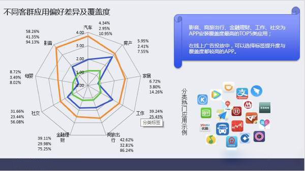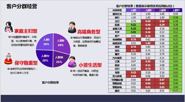 在對商圈人群完成360度用戶畫像后,可從不同維度實現(xiàn)對人群的分類管理。在已有的實踐嘗試中,年齡、婚姻狀況、車輛保有情況、性別、設(shè)備品牌、應(yīng)用偏好都可稱為進一步交叉分析、聚類分析的基礎(chǔ)維度。結(jié)合該商業(yè)地產(chǎn)企業(yè)的自身需求,華錦億爵大數(shù)據(jù)技術(shù)團隊以線上應(yīng)用偏好作為最重要的聚類基礎(chǔ),將商圈內(nèi)人群分為偏好差異明顯的幾種不同類型,從而便于把握不同類型客群的消費特征,為商業(yè)主力客群的選定準備了有力的數(shù)據(jù)支持。