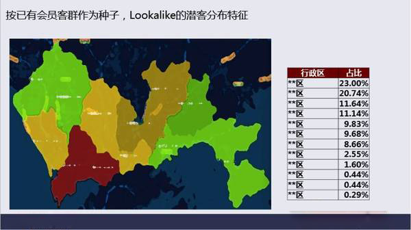 對開發(fā)企業(yè)而言,已有項目的運營操作經(jīng)驗可復(fù)制性高,但在前期定位階段對不同商圈的認知往往無法復(fù)制。結(jié)合大數(shù)據(jù)工具和lookalike算法技術(shù),企業(yè)已積累的消費客群將成為重要的種子數(shù)據(jù),以此作為學習對象,將快速模擬出在不同商圈內(nèi)的潛客分布情況。這一重要突破將快速建立項目定位和目標客群間的映射關(guān)系,極大提升企業(yè)入駐陌生商圈的成功率。