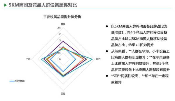 圈取商圈及競品地理圍欄,獲取到的移動設(shè)備數(shù)據(jù)可實現(xiàn)與數(shù)據(jù)中心關(guān)聯(lián)匹配,通過用戶畫像描述其人口屬性特征、設(shè)備使用特征、線上應(yīng)用偏好及線下行為軌跡,更準確地了解商圈人群及競品客群屬性。